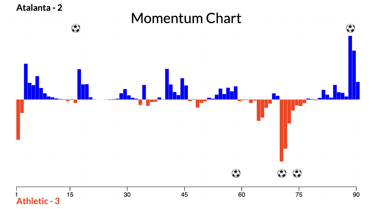 15. Atalanta (down 2). Like Atletico, Atalanta had a fantastic chance to move pretty high up the table and give themselves great odds of skipping to the round of 16. They even took a 1-0 home lead against Athletic Club, and they only allowed four shot attempts all evening.