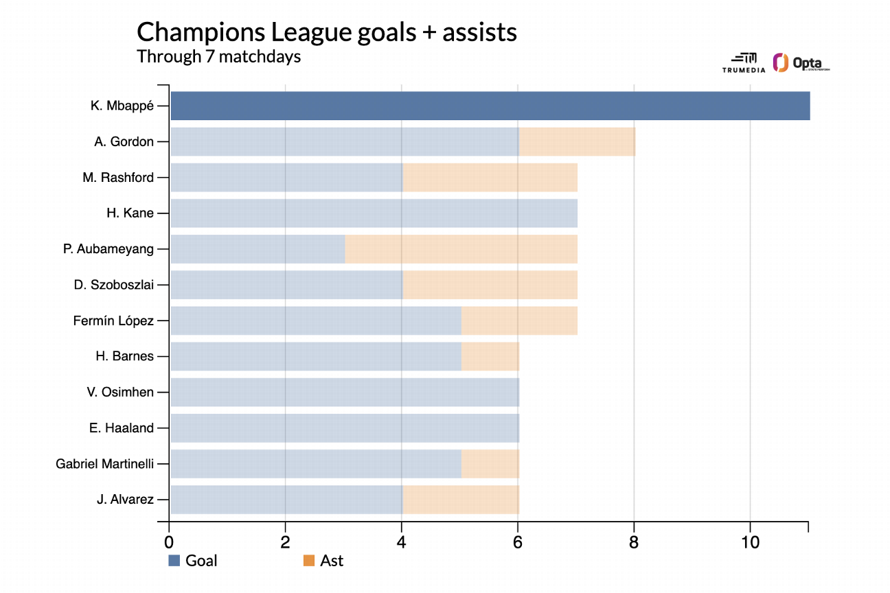 Mbappe's brace gave him 11 goals in the competition; that's so far ahead of the field that he's comfortably generated the most combined goals and assists in the Champions League ... with zero assists.